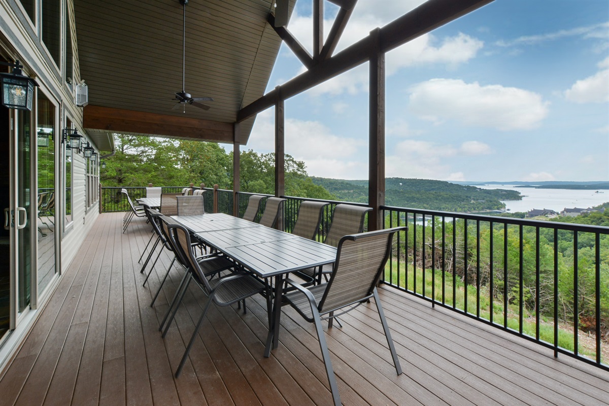 Step through our custom 8’ glass doors onto the main level huge covered deck with 2 ceiling fans for breathtaking MILLION DOLLAR VIEWS overlooking Table Rock Lake. Lots of seating with 4 bronze aluminum patio table sets.